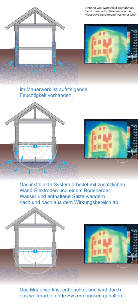 Bei dieser Art der Mauertrockenlegung bringt das Unternehmen qualitativ sehr hochwertige Anoden im Mauerwerk ein und verbindet diese mit einem speziellen Steuergerät. Mit Hilfe dieser kleinen Steuereinheit kann man nicht nur die Elektroden mit einer Kleinstspannung von 6 - 12 Watt versorgen, sondern darüber hinaus auch den gesamten Trocknungsvorgang überwachen und dokumentieren. Das erzeugte elektrische Feld sorgt für eine Umkehrung des vorhandenen negativen elektrischen Potenzials. Das Erdreich kann dadurch die Feuchtigkeit wieder anziehen und auf natürlichem Wege aus den Mauern transportieren. Das Mauerwerk trocknet also schonend aus. Mehr als 1.000 Kunden konnten dieses System von Drymat® schon testen und sind von den Ergebnissen begeistert. Die Installation ist einfach und kann ohne große bauliche Veränderungen oder umfangreiche Vorarbeiten am Mauerwerk vorgenommen werden. Innerhalb weniger Stunden oder Tage ist das Drymat® System installiert und kann in Betrieb genommen werden. Durch den geringen Stromverbrauch des Gerätes sind auch die Stromkosten mit wenigen Kilowattstunden im Jahr sehr überschaubar.